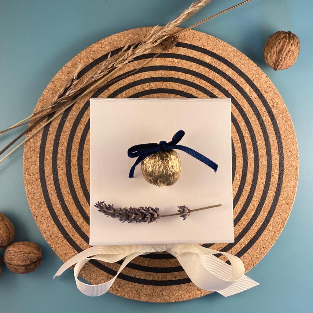 Every walnut is packaged in a beautiful keepsake box. Inside each box sits your walnut, in either silver or gold, with a small velvet ribbon bow and an optional hanging hook.